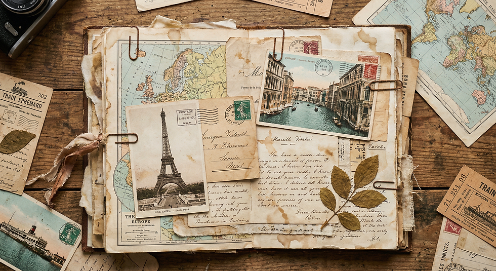 Use a vintage-style postcard as the main element. You can decorate around it with stamps, postal marks, and small travel-themed details.
